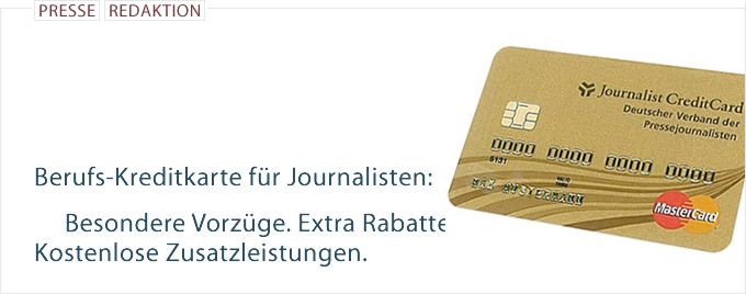Neben den vielen Vorteilen, die Sie bereits als Pressevertreter und Mitglied des DVPJ geniessen, erhalten Sie exklusiv und gebührenfrei die Journalist-CreditCard. Es handelt sich um eine MasterCard Gold, welche für DVPJ-Mitglieder, deren Lebenspartner und Familienangehörige vorbehalten ist. Die Journalist-CreditCard umfasst zusätzliche Vorteile und ist sofort weltweit einsetzbar. Journalisten, Presse-Fotografen, Reporter, Pressevertreter und Medienschaffende erhalten besondere Vorzüge, die Sie anderswo in dieser Konstellation so nicht vorfinden.
